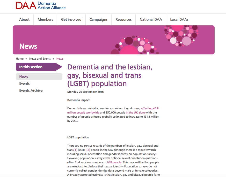 Dementia and the lesbian, gay, bisexual and trans (LGBT) population: blog written for the Dementia Action Alliance